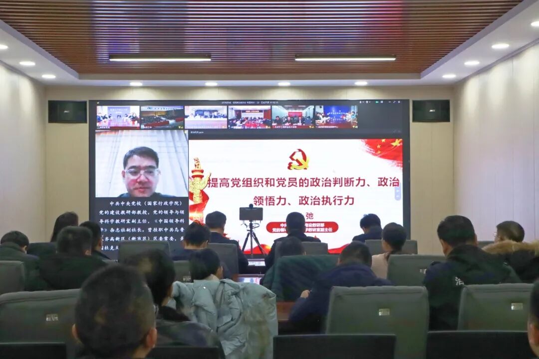 此次培训以线上+线下的方式进行,特别邀请中共中央党校(国家行政学院)党的建设教研部教授,党的领导与领导教学科研室副主任张驰,以“提高党组织和党员的政治判断力、政治领悟力、政治执行力”为主题,围绕加强党的政治建设,以丰富的专业知识和独到得见解,结合历史和现实案例,深入浅出的解析了政治思维能力、政治行为能力、政治监督等方面的内容,为参训党员上了一堂生动的党课。